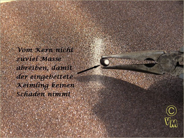 - Es wird nur wenig Schale beseitigt, damit der Schliff nicht zu tief in den Kern eindringt und eventuell von dieser Seite aus den Keimling beschädigt. (5/16)