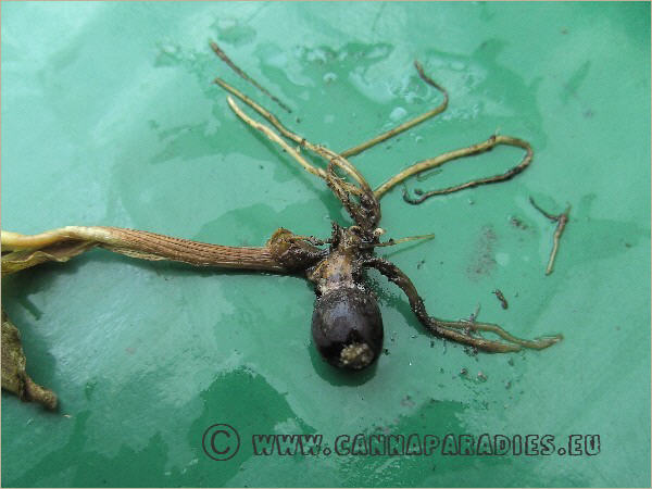 | Umkippkrankheit 3 - Hier noch mal ein verendetes Pflänzchen, an dem aber jetzt auch besonders gut zu erkennen ist, dass Blatt und Wurzeln an derselben Seite austreiben. Zudem ist auch noch die Anschleifstelle bestens sichtbar. (15/16) | ||