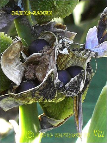 Sehr viele Canna Arten bilden, bis in den Spätherbst hinein, warzenförmige Samenkapseln. Deren Inhalt kann geerntet werden, sobald diese vertrocknet sind und aufplatzen. Die eigentlichen Samen ähneln kleinen runden Perlen und sind steinhart. Sie zeigen vorwiegend eine schwarze Farbe, in wenigen Fällen aber auch nur die einer dunkelbraunen. Man nennt sie auch die Einjährigen. Sie tragen in sich das Geheimnis möglicher neuer Canna Sorten (siehe auch Abschnitt Vererbung).