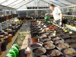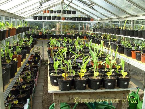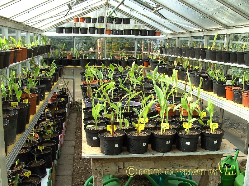Dieses Bild zeigt den Stand von vorgezogenen Rhizomen und Samen Ende März. Die Rhizome wurden Anfang März getopft, die Samen bereits Anfang Januar. Im Vordergrund befinden sich die Jungtriebe aus Samen,während die große Masse aus der Zucht mit Rhizomen hervorging. Das Gewächshaus wurde nicht beheizt. |