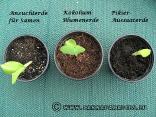 Bei meinen Saatversuchen, mit unterschiedlichen Erden, erzielte die Kokohum-Blumenerde das beste Ergebnis. Durch ihre lockere, luftdurchlässige Konsistenz bietet sie den jungen Keimlingen eine fast optimale Ausbreitungsgrundlage für deren frisches Wurzelgebilde. Außerdem hält sie um ein Mehrfaches länger die Feuchtigkeit vor. Während die ausprobierten Anzucht-, Aussaat- und Pikiererden relativ dicht zusammen pappen, ist auch noch eine erheblich schnellere Austrocknung zu beobachten. Wichtig ist jedoch bei der Verwendung von Kokohum eine wöchentliche Versorgung mit gutem Flüssigdünger, da dieses Material keine eigene Basisdüngung besitzt. Mit der Düngegabe beginnt man aber nur, wenn die ersten ein bis zwei Blatttriebe ausgebildet sind. Diesbezüglich recht gute Erfahrung sammelte ich beim Einsatz von "COMPO Blumendünger mit Guano".
