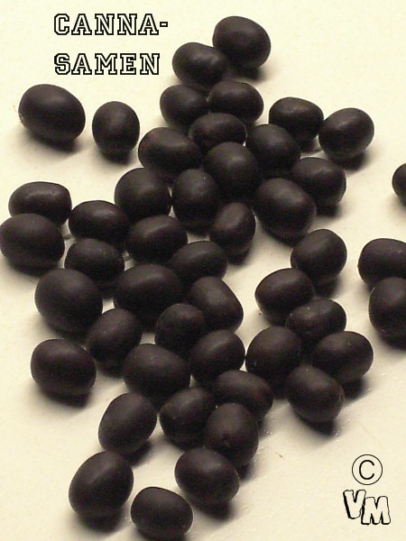 Kreation oder Standard aus Einjährigen? Das ist hierbei die spannende Frage. Die Zucht von Canna Pflanzen aus Samen erweist sich um einiges schwieriger, als die mit Rhizomen. Doch damit besteht jedes Mal die verheißungsvolle Chance, eine völlig neue Sorte in die Welt zu bringen. Bevor man die Samenperlen in kleine Blumentöpfe setzen kann, muss erst einmal ihre steinharte Umhüllung geknackt werden. Kommen sie nämlich im Originalzustand in die Erde, kann es viele Monate dauern, bis sie keimen. So habe ich eine Menge Tipps gelesen, wie sie sich viel schneller aus ihrer Schale locken lassen. Die einen legen sie in das Gefrierfach, andere übergießen sie mit kochendem Wasser und manche lassen sie im warm durchnässten Toilettenpapier erst einmal tagelang quellen. Doch mir gefiel der Hinweis mit dem Anschliff am günstigsten und ich sollte mit dieser Auffassung Recht behalten. Die häufig verbreitete Ansicht, indisches Blumenrohr, aus Samen gezogen, blühe erstmals im folgenden Jahr, trifft mit der von mir praktizierten Methode nicht zu. Sie ist zwar mühsam und dürfte für die professionelle Anwendung wenig geeignet sein, dafür erweist sie sich aber als sehr effizient. Ich habe meine mit Samen angesetzten Cannas ab Ende Juni genauso in der Blüte, wie die aus Rhizomen gezogenen. Man muss die Samen lediglich bereits Anfang bis Mitte Januar in die Töpfchen bringen. In der nun folgenden Galerie zeige ich auf, wie sich die Zucht mit Canna Samen angehen lässt. Beachten Sie bitte auch die ergänzenden Hinweise im Kapitel 'Fragen u. Antworten'.