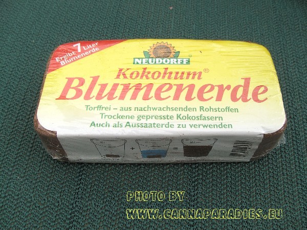 Kokohum ist eine zusammengepresste Kokosmasse. Das Brikett legt man in einen 10 Liter Eimer, fügt 4 Liter Wasser hinzu, in dem es sehr rasch aufquillt, so dass schließlich etwa 7 Liter feinporige Blumenerde für das Canna-Saatgut entsteht. - (Klick auf das Bild) -
