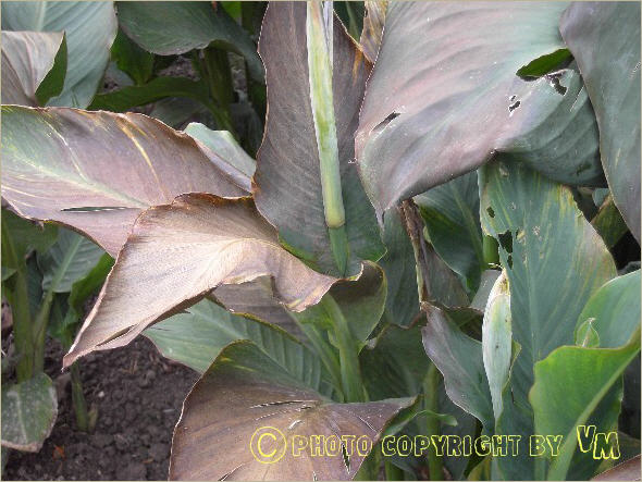 - Bereits einen Tag nach dem ersten Frost zeigt auch die Canna-Staude sehr starke Schäden. Ihre Blätter fangen sofort an zu welken. (3/25)