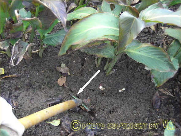 - Mit einer Spatengabel ist weiträumig um die Staude herum, aus allen vier Himmelsrichtungen, in den Boden einzustechen und damit der Rhizomstrang zu lockern. (5/25)