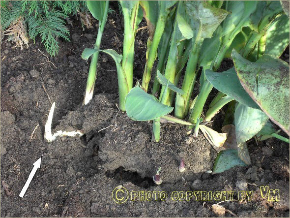 - Dieses Bild zeigt, wie weit die sehr leicht zerbrechlichen Jungrhizome von der Mutterpflanze entfernt, versteckt unter der Erde liegen. (7/25)