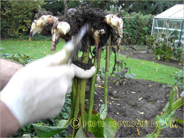 - Der Staudenbüschel wird mit einer Hand festgehalten und die am Rhizom anhaftende Erde vorsichtig von den Rhizomsprossen gekratzt. (12/25)