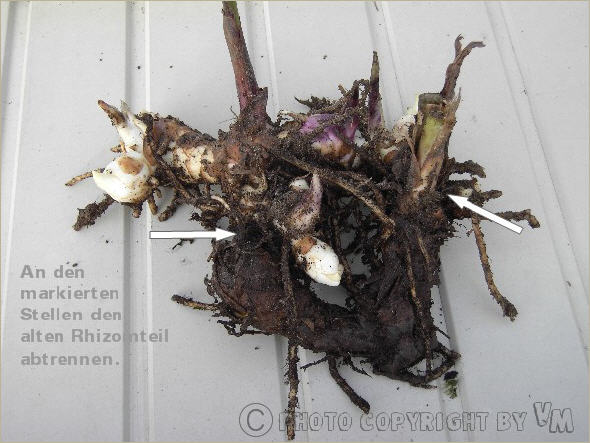 Demo 5 - Das auf diesem Bild festgehaltene Rhizom ist ein sehr schönes Beispiel in seiner Gesamtheit. Man sieht besonders gut das noch alte Mutterteil, welches normalerweise nicht mehr vorhanden sein dürfte, weil es seine Kraft verbraucht haben und danach abgefault sein müsste. Daneben ein Rest des alten Blatttriebes und schließlich das frisch ausgebildete neue Rhizom. Das alte (schwarze) Mutterrhizom muss in solch einem Fall abgetrennt werden und darf nicht mit in den Winterbestand folgen. (21/25) |